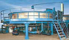 我廠自行設計研制的QF型高效淺池氣浮裝置針對傳統(tǒng)氣浮設備的不足之處,把原水進口、凈化水出口設計為移動式,分離過程為靜態(tài),以縮短源水腫的氣泡上浮時間,池子中水的流態(tài)基本上相對靜止。原水中的懸浮物從池底浮到表面的速度快(可達40-100MM/MIN),水深只需400-500MM就可以了,也就是說停留時間3-5分鐘,原水達到凈化要求。為了使進、出口能同步轉(zhuǎn)動,該機設計成圓形。