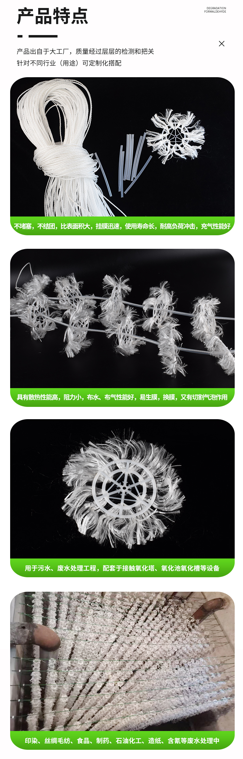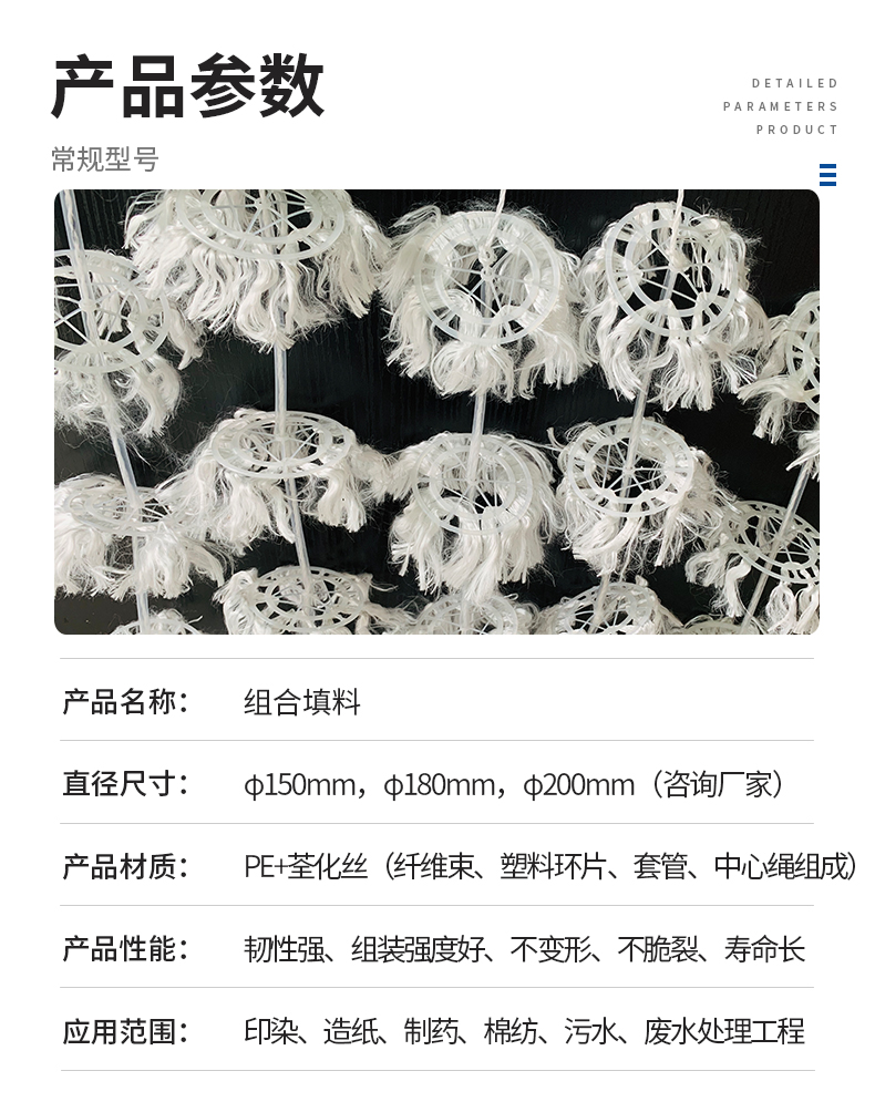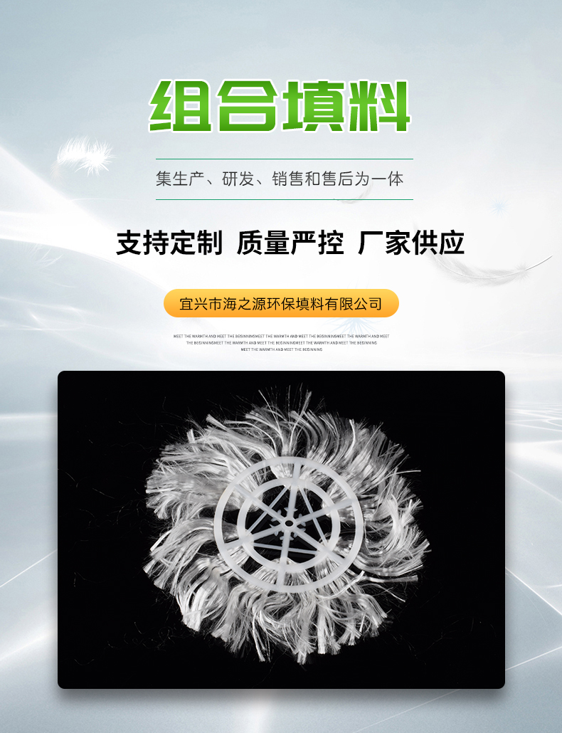 組合填料是在軟性填料和半軟性填料的基礎(chǔ)上發(fā)展而成的,它兼有兩者的優(yōu)點。其結(jié)構(gòu)是將塑料圓片壓扣改成雙圈大塑料環(huán),將醛化纖維或滌綸絲壓在環(huán)的環(huán)圈上,使纖維束均勻分布;內(nèi)圈是雪花狀塑料枝條,既能掛膜,又能有效切割氣泡,提高氧的轉(zhuǎn)移速率和利用率。使水氣生物膜得到充分交換,使水中的有機(jī)物得到高效處理。