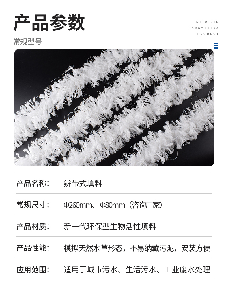辮帶式水處理填料是新一代環(huán)保型生物活性填料,模擬天然水草形態(tài),不易納藏污泥,充氧時管狀直徑具有可變性,無堵塞;具有親水、親油、對氣泡有很好的切割作用,有儲氧功能,吸附能力強;同時由于受水流和氣流的沖動