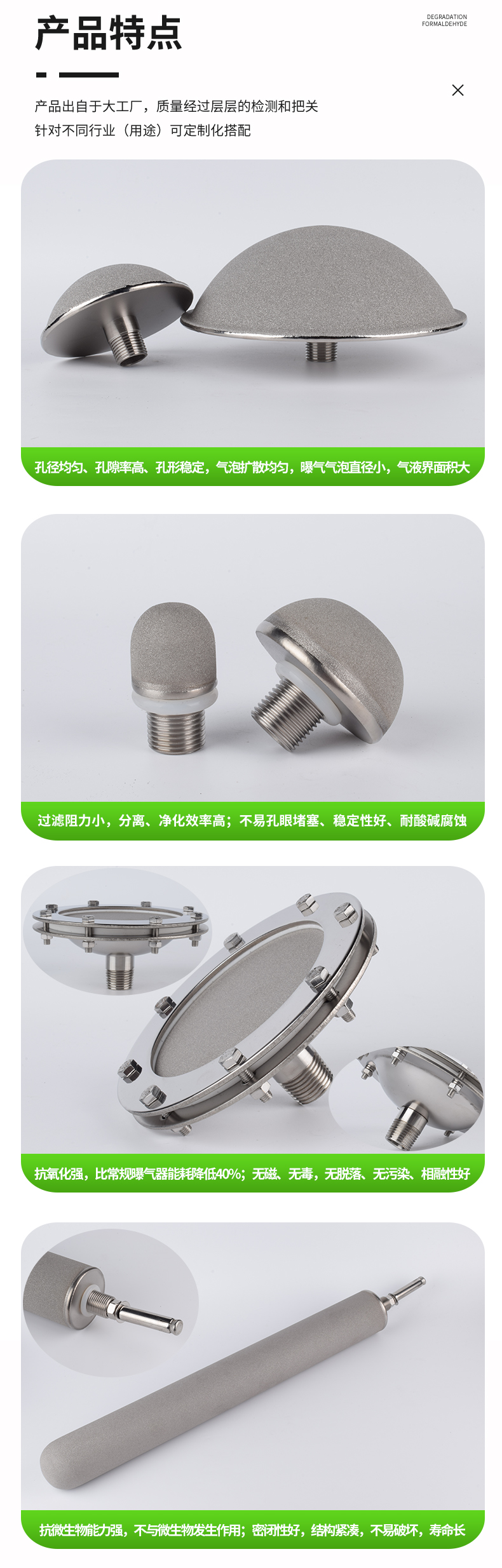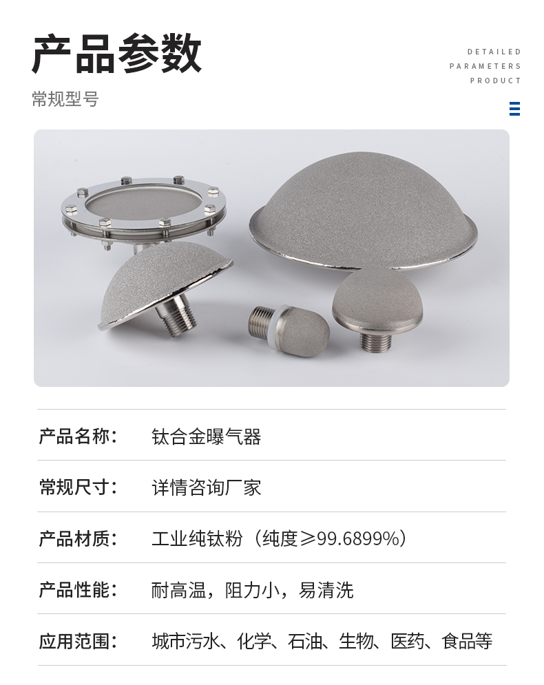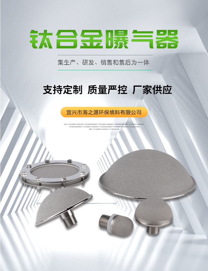 鈦合金曝氣器是以工業(yè)純鈦粉(純度≥99.6899%)為主要原料,經(jīng)過純鈦金屬粉末真空燒結(jié)而形成的多孔材料,再經(jīng)過不同的組合方式制作而成的曝氣裝置。