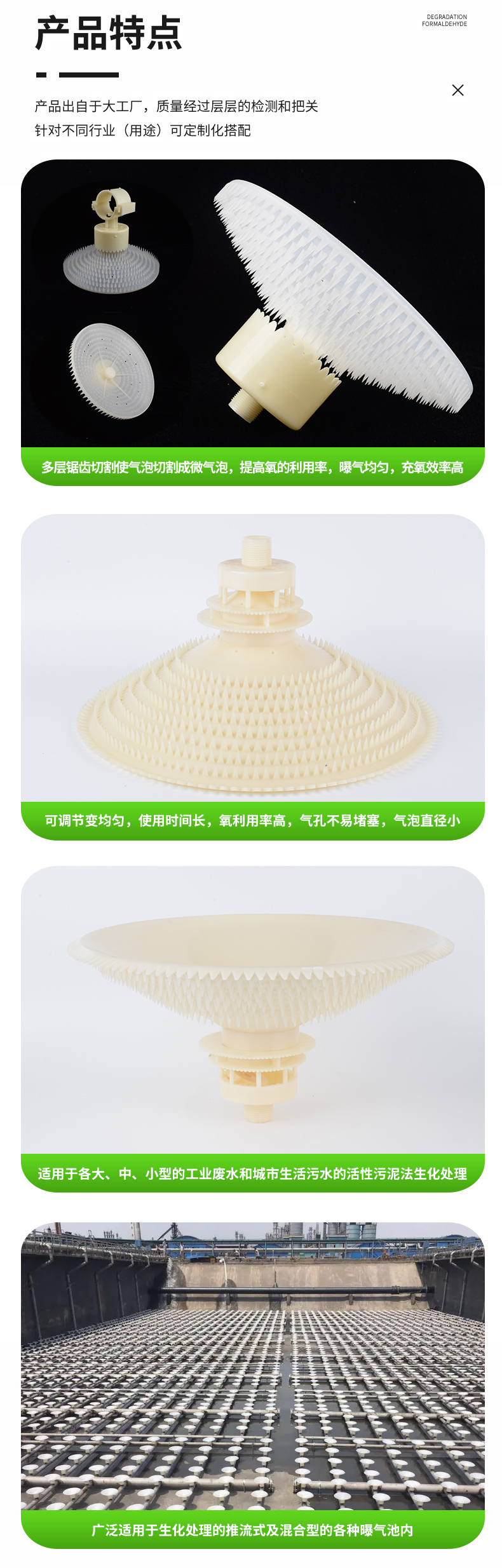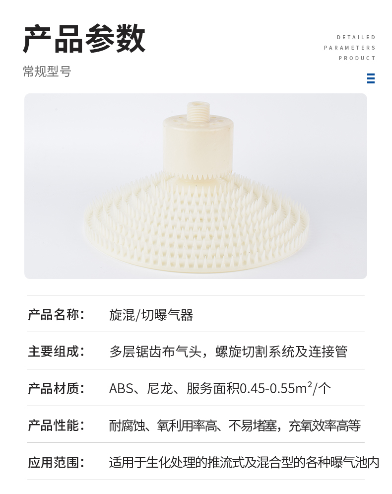 旋混式曝氣器采用多層螺旋切割的型式進行充氧曝氣,旋混式曝氣器當氣流進入260型混流型曝氣器時,氣流首先通過二道螺旋切割系統(tǒng),切割后進入下層的的多層鋸齒型布氣頭,進行多層切割,使氣泡切割成微氣泡,這樣大大提高了氧的利用率,具有布氣均勻,充氧效率高的特點。