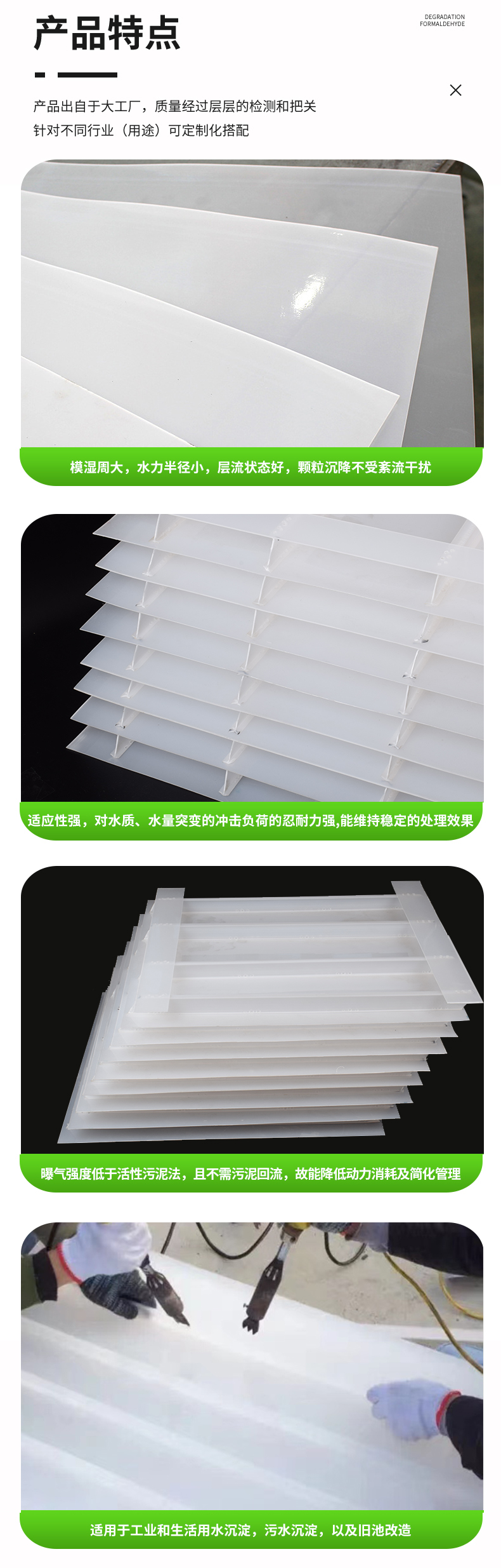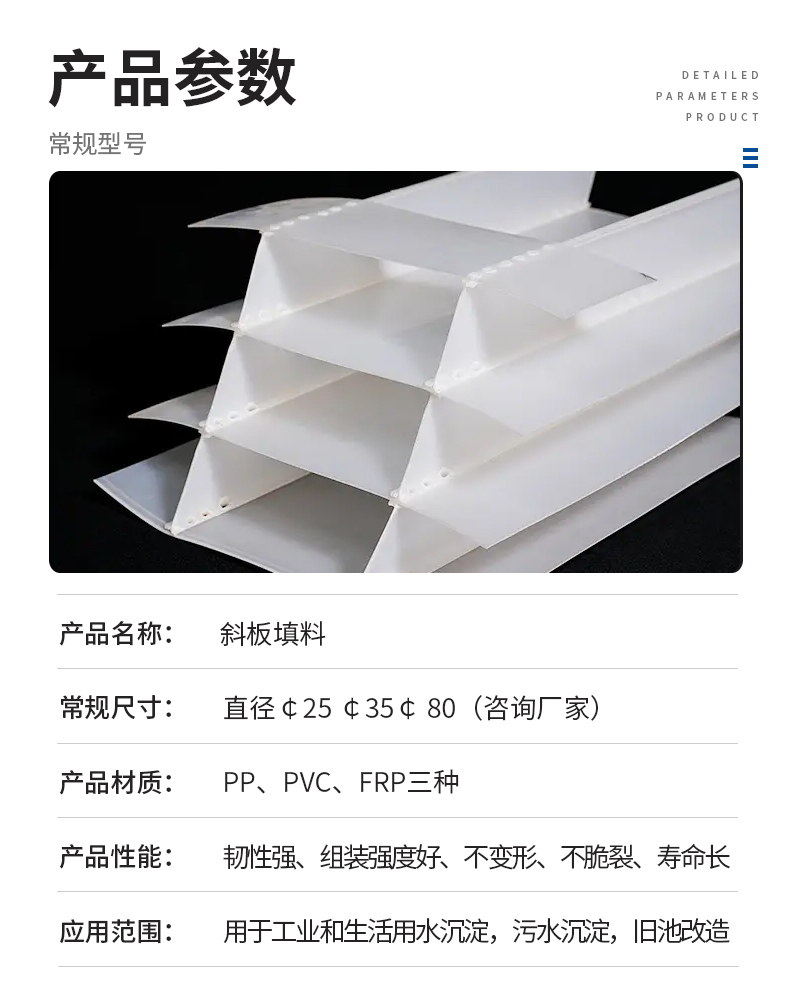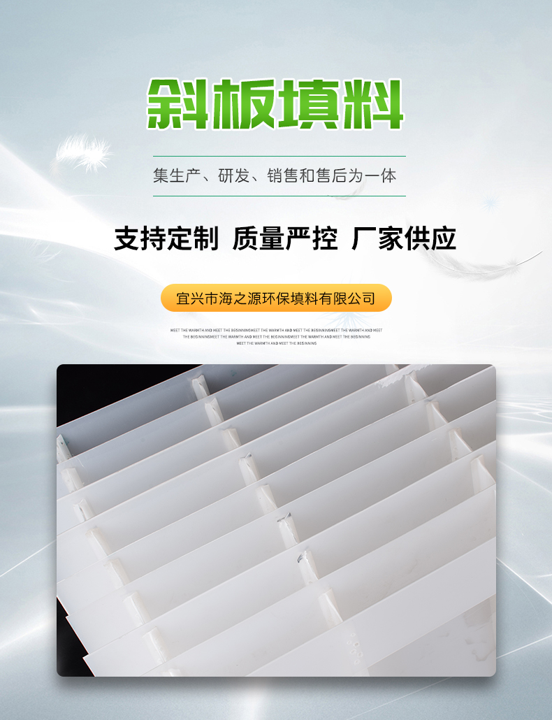 斜板填料、乙丙共聚斜板填料、小間距斜板填料主要由乙丙共聚材料加工制成。在淺層理論的基礎(chǔ)上,在斜板上部設(shè)置沉淀距離合理的沉淀段,在下部控制斜板的幾何形狀,使斜板下部形成穩(wěn)定的接觸絮凝段,通過接觸作用和淺池沉淀機(jī)理達(dá)到礬花與水分離的目的。 斜板填料按構(gòu)造型式可分為:①小間距斜板填料  ②接觸絮凝斜板填料  ③復(fù)合斜板填料。