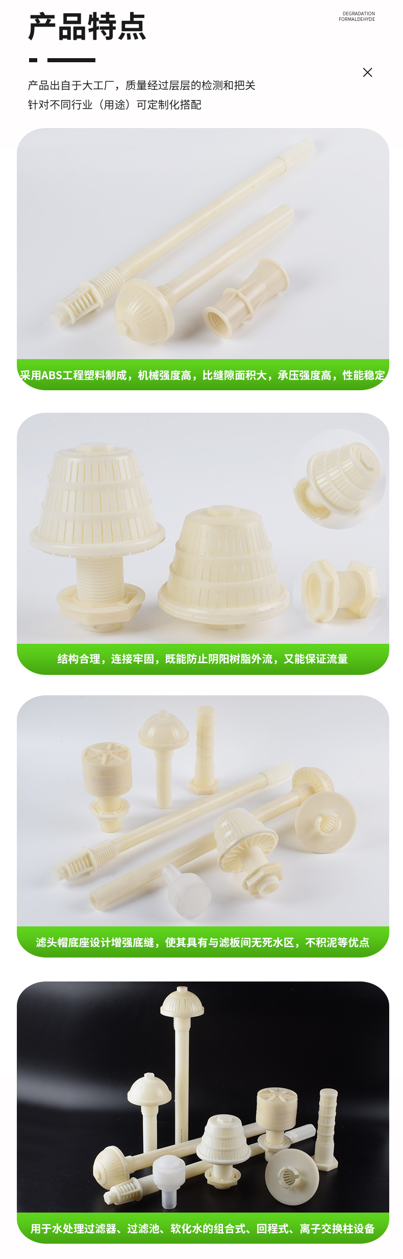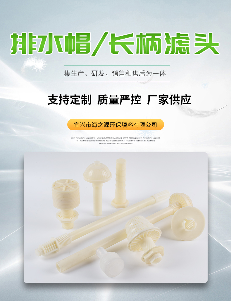 濾頭又叫濾帽,用在濾池配水系統(tǒng)和過(guò)濾器中。反沖洗濾頭包括排水帽、濾水帽兩種,均采用ABS工程塑料制成,結(jié)構(gòu)合理,連接牢固,承壓強(qiáng)度高,縫隙不變型,使用效果好,既能防止陰陽(yáng)樹(shù)脂外流,又能保證流量。適用于濾池汽水反沖洗系統(tǒng)和軟化水質(zhì)組合式,壓力式,回程式及離子交換器等水處理設(shè)備的過(guò)濾裝置。