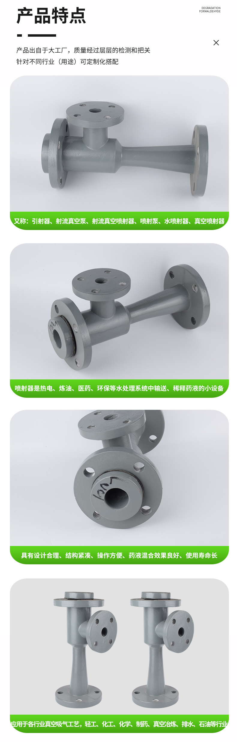 噴射器--原WGP型,適用藥液:鹽酸、堿 。噴射器是熱電、煉油、醫(yī)藥、環(huán)保等水處理系統(tǒng)中輸送、稀釋藥液的小設(shè)備,具有設(shè)計合理、結(jié)構(gòu)緊湊、操作方便、藥液混合效果良好、使用壽命長等優(yōu)點。調(diào)節(jié)濃藥液進(jìn)口閥門及調(diào)節(jié)墊片的厚度,使出口藥液達(dá)到所要濃度。注意:安裝時需要特別注意噴射器法蘭與鐵法蘭之間的平行度和垂直度。