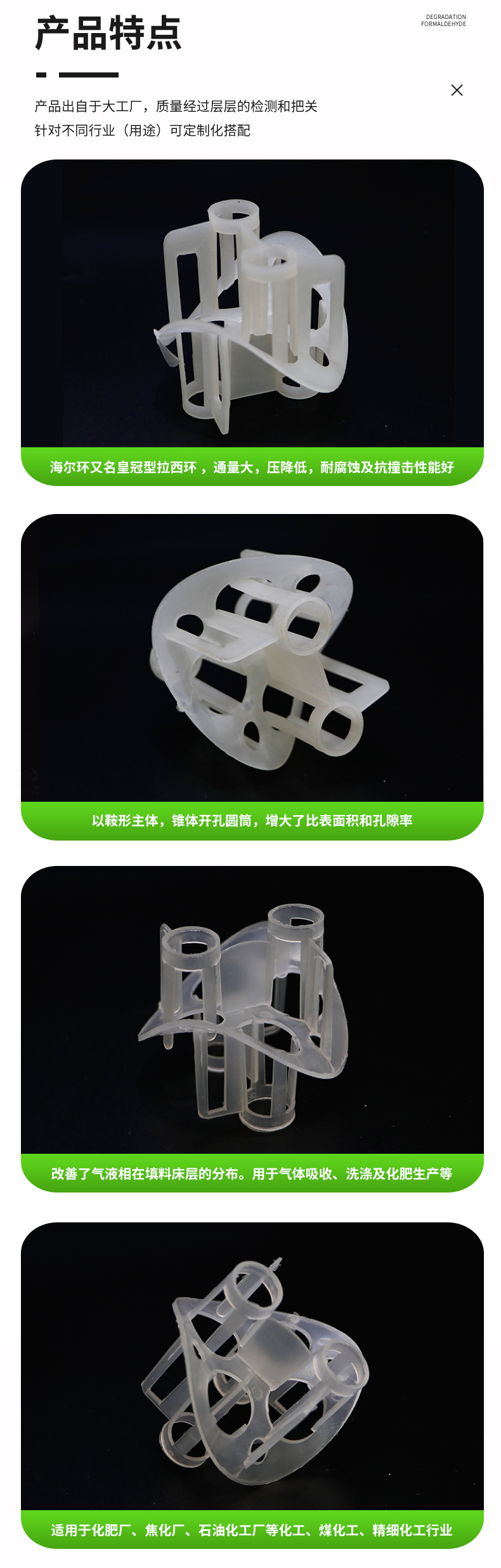 聚丙烯海爾環(huán)填料主要采用聚丙烯的化學(xué)穩(wěn)定性很好,除能被濃硫酸及濃硝酸侵蝕外,對其他各種化學(xué)試劑都比較穩(wěn)定,同時它的化學(xué)穩(wěn)定性隨結(jié)晶度的增加還有所提高。產(chǎn)品經(jīng)注塑成復(fù)雜結(jié)構(gòu)的優(yōu)點,以鞍形為主體,錐體開孔圓筒,增大了比表面積和孔隙率,改善了氣液在填料層的分布。產(chǎn)品具有低壓降、填料層氣液分布均勻,抗污性強。
