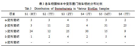 由表3可知,各樣品中β-變形菌綱及γ-變形菌綱類較多,這與Lin等[26]在人工污水系統(tǒng)中發(fā)現(xiàn)最豐富的菌種為β-變形菌綱,其次是γ-變形菌綱結果相似。以MT生物膜樣本為例,β-變形菌綱、γ-變形菌綱及δ-變形菌綱占比分別達33%、16%及6%。