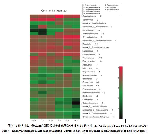 為進一步揭示其群落結構差異,基于細菌菌門水平(圖6)、變形菌門(表3)及菌屬水平(圖7)分析生物膜上的微生物群落結構組成。由圖6可知,從菌門水平來看,不同填料反應器中微生物群落組成的差異不是特別大。6種填料生物膜樣本的主要菌群均為變形菌門(Proteobacteria)、擬桿菌門(Bacteroidetes)、厚壁菌門(Firmicutes)及放線菌門(Actinobacteria)。以MT反應器為例,其生物膜樣本變形菌門占比達56.2%,其次是擬桿菌門(25.3%)、厚壁菌門(14.8%)。其他5種填料生物膜樣本上的變形菌門占比介于28%~54.3%,擬桿菌門占比介于23.5%~57.3%,厚壁菌門介于9.2%~16.1%。該結果與前人研究結果相近,如Ma等[21]在序批式反應器中發(fā)現(xiàn)的細菌群落組成中變形菌門(占比最大)、擬桿菌門及放線菌門占優(yōu)勢;Snaidr等[22]在常規(guī)活性污泥中對菌群多樣性的研究中發(fā)現(xiàn)變形菌門(Proteobacteria)為優(yōu)勢類群。在6個樣品中還有綠彎菌門(Chloroflexi)、浮酶菌門(Planctomycetes)、綠菌門(Chlorobi)及單胞菌門(Gemmatimonadetes)等,但所占比例均不同。其中綠菌門在顆粒化過程中有重要作用,能夠增強污泥的沉降性能。